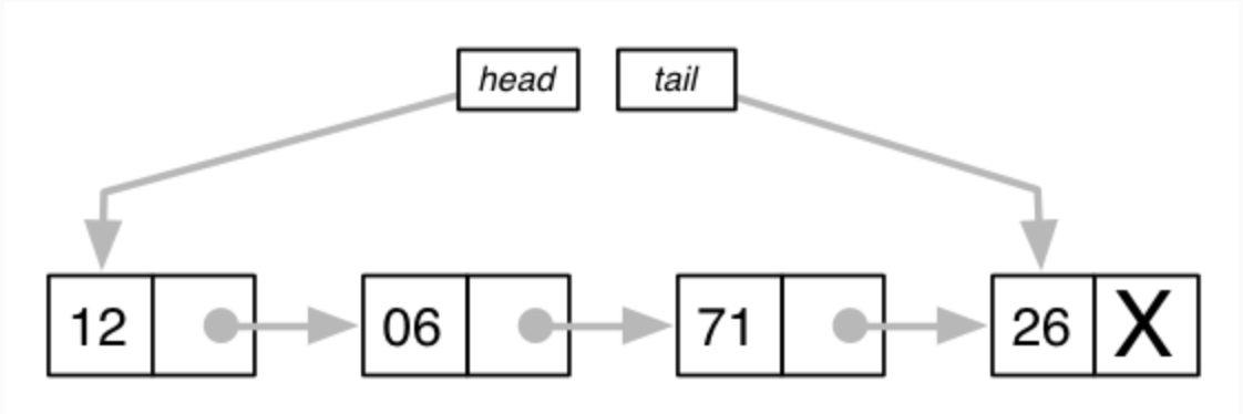 Linked List는 아래에 있는 이미지처럼 연결되어있는 선형 데이터 구조이다. 데이터는 노드에 저장되며, 리스트의 맨 앞 부분을 head 맨 뒤에 있는 부분을 tail이라고 하며 다음(next)노드의 정보를 가지고 있다.